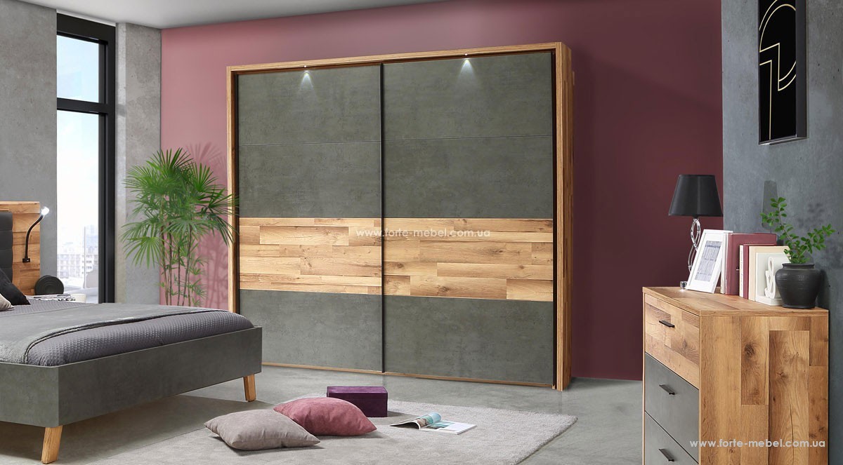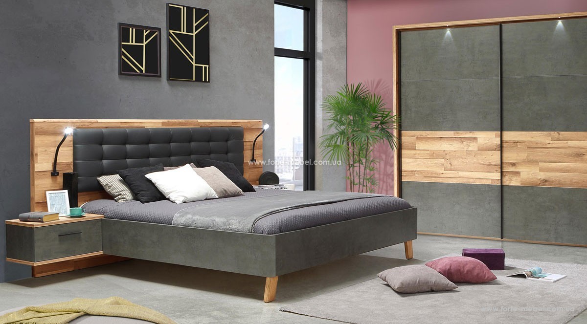 Подголовник кровати привлекает внимание в коллекции. Обитая поверхность, заключенная в дубовые рамы и дополненная подсветкой, притягивает взгляд и подчеркивает характер всего интерьера. Кроме того, каркас кровати дополнен набором стильных прикроватных тумб. Элегантный и одновременно вместительный шкаф (2 ширины на выбор) в сопровождении световых полос не только добавит серьезности, но и выделит всю комнату.